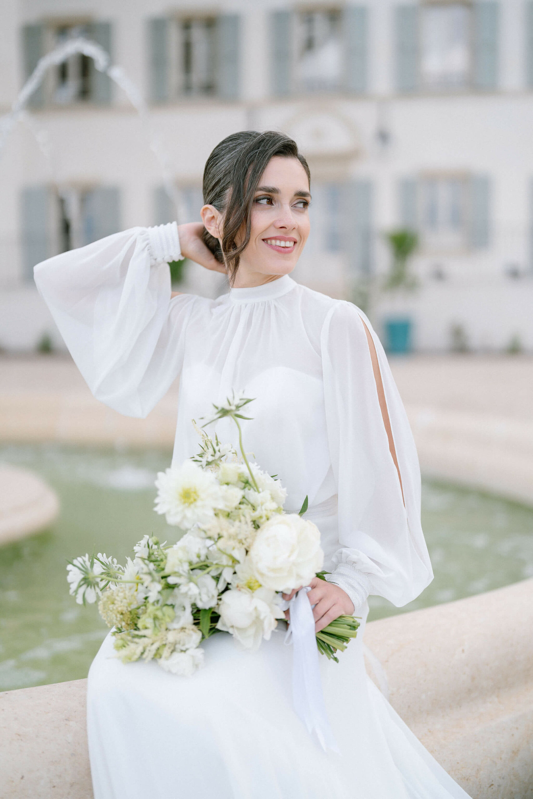 Pour ce shooting, nous avons imaginé une atmosphère mêlant romantisme provençal et raffinement intemporel. Les superbes et délicates compositions florales sur des tons de blancs et verts ont permis de sublimer la beauté naturelle du château.